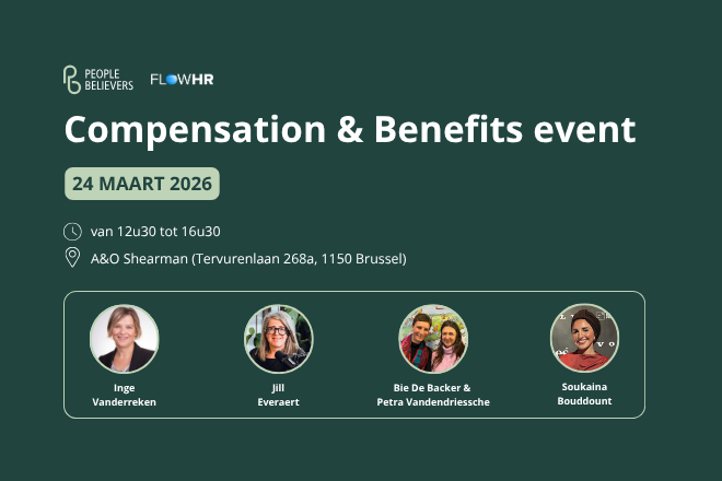 Op 24 maart 2026 organiseert FlowHR in samenwerking met People Believers een exclusief Compensation & Benefits event voor HR Managers, HR Directors en Comp & Ben experten. Tijdens deze interactieve namiddag verdiepen we ons in de nieuwste ontwikkelingen rond belonen, met bijzondere aandacht voor loontransparantie en de impact ervan op HR-beleid.